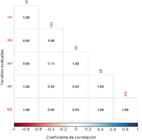 El análisis de correlación identificó 10 correlaciones, todas positivas. 9 correlaciones mostraron valores iguales o superiores a 0.90. Específicamente, las variables HP y MF; HP y MS; MF y MS presentaron valor absoluto de correlación de 1 ***, lo que indica una correlación perfecta entre ellas (figura 4). Por su parte, el análisis del PCA reveló distintos agrupamientos para cada uno de los tratamientos, con 94.4 % de la variación explicada por la primera dimensión (figura 5).