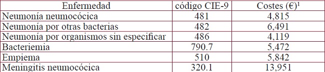 Costes en el modelo. La perspectiva elegida para el modelo fue la del Sistema Nacional de Salud (SNS). El coste de la vacuna financiado correspondió al precio unitario del envase clínico de 10 unidades después de aplicar una deducción de -7,5% según Real Decreto-ley 8/2010, de 20 de mayo20, y correspondió a 40,70 € por unidad. No se tuvieron en cuenta los costes de su administración, por poder llevarse a cabo de forma simultánea a la vacuna antigripal. Los costes de hospitalización de las diferentes enfermedades asociadas con la EN para población general -no perteneciente a grupos de riesgo-, según la clasificación de CIE-918 y para el grupo de 65 a 69 años de edad, correspondieron al promedio observado en el CMBD de los años 2010 a 2013, ambos inclusive18, detallados en la Tabla 2. Con respecto a los costes del tratamiento de la neumonía ambulatoria, se asumieron los observados para la neumonía adquirida en la comunidad (NAC) de origen neumocócico y de carácter ambulatorio del estudio de Badalona que correspondieron a 485€ por caso12.