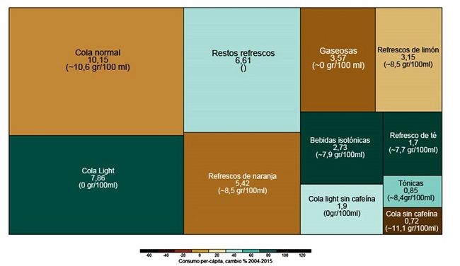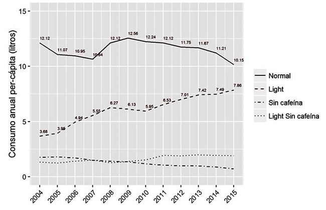 Se estima que 184.000 muertes anuales en el mundo son atribuibles al consumo de bebidas azucaradas (BA): 133.000 (IC 95%: 126.000-139.000) por diabetes mellitus, 45.000 (IC 95%:26.000-61.000) por enfermedades cardiovasculares y 6.450 (IC 95%:4.300-8.600) por cáncer. El 5% de las muertes relacionadas con las BA ocurren en países de renta baja, el 70,9% en países de renta media y el 24,1% en países de renta alta. La proporción de mortalidad atribuible a las BA oscila entre el <1% en japoneses mayores de 65 años y el >30% en mexicanos menores de 45 años. México presenta la mayor mortalidad absoluta (405 muertes por millón de adultos) y proporcional (12,1% de todas las muertes) por BA11. Los datos para España son: 30 (IC 95%:23-27) muertes por millón de adultos y un 0,6% (IC 95%:0,5-0,8) de todas las muertes son atribuibles a las BA. En España el consumo de gaseosas y bebidas refrescantes en el hogar en 2015, según el panel de consumo en hogares del Ministerio de Agricultura Alimentación y Medio Ambiente12 basado en una muestra de 6.200 hogares, fue de 44,6 litros por persona y año (41.8 litros en 2004, incremento del 6,7% en una década). El 46,2% del total corresponde a refrescos de cola (Figura 1). En la última década ha habido un continuo proceso de sustitución de refrescos con azúcar añadido por refrescos light, cuyo consumo per-cápita más que se duplicó desde 2004 (Figura 2).