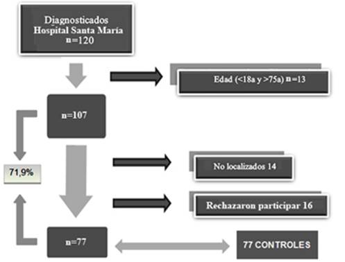 De un total de 120 casos elegibles, 13 fueron excluidos por no cumplir criterios de inclusión por su edad. De la población total de estudio, 14 no pudieron ser localizados y 16 no quisieron participar. Finalmente los casos fueron 77, lo que representó el 71,9% de la población objeto de estudio (77/107). Se seleccionaron 77 controles (figura 1).