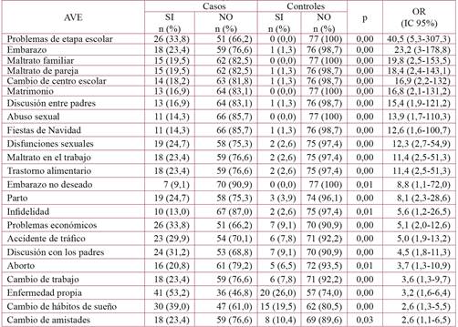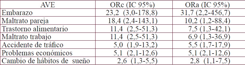 En la tabla 1 se presentan los acontecimientos vitales percibidos como estresantes con asociación estadísticamente significativa en el análisis univariante y en la tabla 2 se presentan los AVE que se mantuvieron asociados de forma independiente tras el análisis multivariante: embarazo OR=31,7 (IC95%:2,2-456,7), maltrato por parte de la pareja OR=10,2 (IC95%:1,2-88,4), mobbing OR=6,9 (IC95%:1,3-36,9), trastornos de alimentación OR=7,5 (IC95%:1,3-42,1), accidente de tráfico OR=5,5 (IC95%:1,7-17,9), problemas económicos OR=5,1 (IC95%:2,1-12,6) y cambios de hábitos de sueño OR=2,8 (IC95%:1,1-7,5).