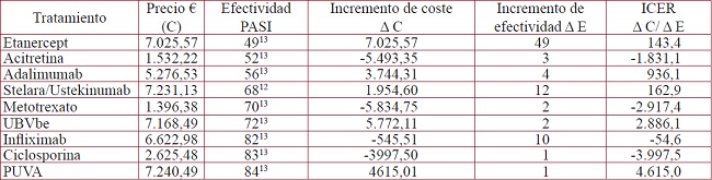Methods: We developed a model of economic evaluation in psoriasis collecting all the many direct and indirect costs of each treatment. The effectiveness indicator used was Psoriasis Area Severity Index [PASI 75] which is generally acceptable in studies of psoriasis. The effectiveness indicator was a PASI 75. Subsequently we calculated the Incremental Cost-Effectiveness Ratio (ICER) for the period of 12 weeks and PASI 75, ordering treatments by level of effectiveness at the expense of treatment costs.