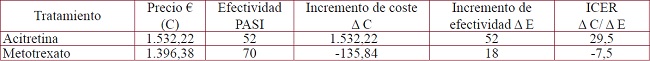 Con los datos obtenidos, se simplifican los resultados, se eliminó el tratamiento de UVBbe (ICER 2.886,1) y PUVA (4.615) ya que los tratamientos más caros y menos efectivos pueden eliminarse y se recalcularon los ICER con los tratamientos restantes. Así el tratamiento más coste efectivo fue metrotexato (ICER -7,5). Vemos los resultados en la tabla 3.