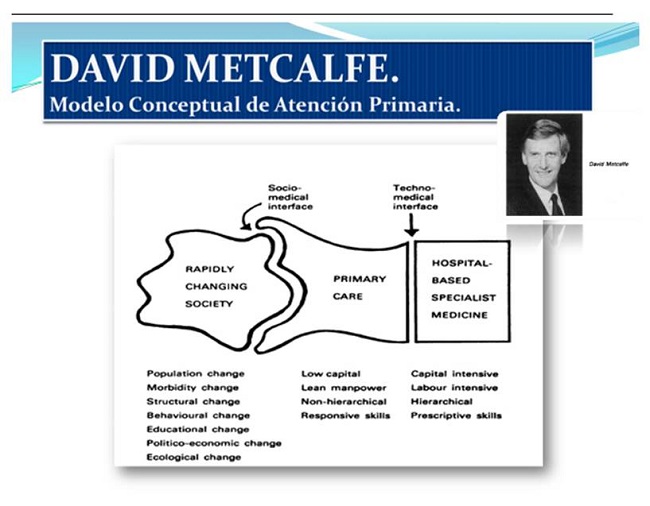 David Metcalfe llegó a ser Profesor de Medicina de Familia de la Universidad de Manchester y también una de las figuras más ejemplares. En 1986 pronunció la conferencia William Pickles titulada El Crisol, en la que defendió la utilidad de la consulta clínica como generadora de conocimiento. El médico debía mantener siempre una actitud humilde ante los nuevos avances y aprendizajes. Pero la aportación fundamental a la historia de la atención primaria europea fue, sin duda, su modelo conceptual de atención primaria que para nosotros aún perdura (Figura 1)20. La descripción de las interfases con la comunidad y con la medicina hospitalaria es magistral.