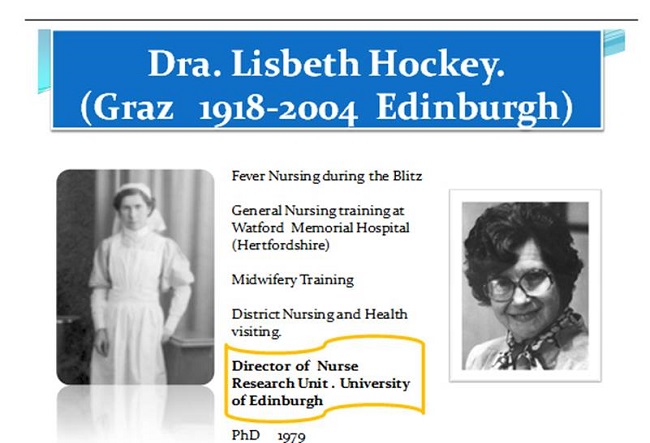 Lisbeth Hockey (1918-2004) nació en Austria y, al igual que John Fry, tuvo que emigrar a las islas por la persecución nazi en los años 30. Fue enfermera de pacientes con enfermedades infecciosas, matrona y enfermera de distrito, doctorándose en 1979. Llegó a ser responsable de la Unidad de Investigación en Cuidados de la Universidad de Edimburgo (Figura 2). En el año 2000 recibió la medalla de oro del Queen´s Nursing Institute. Murió con 85 años, manteniendo actividad intelectual hasta pocos meses antes26.