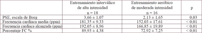 En la Tabla 2 se muestran las diferencias entre grupos en relación a la percepción subjetiva del esfuerzo (PSE) y el porcentaje de frecuencia cardíaca durante el tratamiento. La PSE fue 3,66±1,07 en el grupo HIIT, mientras que el grupo de entrenamiento continuo presentó un valor de 2,13±1,65. El porcentaje de trabajo en términos de porcentaje de frecuencia cardíaca fue de 89,93%±4,38 en el grupo HIIT y 72,92 ± 7,25 en el grupo CON. En cuanto a la FC alcanzada por cada grupo, se observaron distintos valores para el grupo HIIT (192,05±8,96) que para el grupo CON (166,85±19,89).