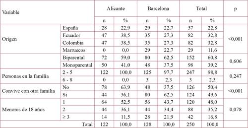 Características sociodemográficas de las familias reclutadas. En total se reclutaron 250 familias, 82 procedentes de Ecuador, 82 de Colombia, 29 de Marruecos y 57 españolas (tabla 1). De ellas 152 (60,8%) se identificaron como biparentales. El 98,8% de las familias se componían de 2 a 5 miembros. El 49,6% convivía con otra familia que no pertenecía al mismo hogar, pero que vivía en la misma vivienda, caso que se daba más en Barcelona (62,5%) que en Alicante (36,1%; p<0,001). En el 48,0% de las familias había un menor de 18 años y en el 35,2% había dos, siendo el 16,8% las que tenían 3 o más menores.