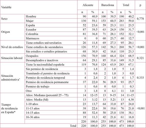 El 76,5% de personas adultas nacieron fuera de España y todas tenían tarjeta sanitaria. El 67,1% tenía la nacionalidad española y el 25,7% tenía permiso de residencia permanente. Llegaron al país entre 1979 y 2014 y llevaban una media de 13 años en España en el momento de la entrevista, con una desviación típica de 4,38.