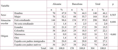 Como muestra la tabla 3, se entrevistó a 304 adolescentes de entre 12 y 17 años de edad. El 53,9% eran mujeres y el 98,0% estaba estudiando. El 27,1% de los adolescentes nació en España pero pertenecían a familias inmigradas, es decir, que sus padres nacieron fuera de España, y el 24,4% eran del grupo que nació en España de padres españoles.