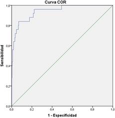El análisis del total de nuestros casos mediante el modelo sirvió para la construcción de la curva COR que se muestra en la figura 1. El área bajo la curva fue de 0,943 (IC95%=0,898-0,987). El punto de corte escogido se situó en una probabilidad p=0,1526 obteniéndose con ello una sensibilidad de 0,840 y una especificidad de 0,931. Los valores de la razón de verosimilitud positiva y negativa fueron 12,17 y 0,172 respectivamente. El índice de Youden calculado se estimó en 0,771.
