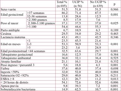 De un total de 1.006 lactantes con bronquiolitis ingresados durante las cinco temporadas epidémicas, en 774 se detectó el VRS en aspirado nasofaríngeo de los cuales 719 eran menores de 6 meses. Se excluyeron 45 casos por tener patología previa y 34 por ser prematuros de menos de 32 semanas de gestación. Finalmente, un total de 695 lactantes cumplieron los criterios de inclusión en el estudio. Se registraron 56 ingresos en UCIP para VM durante la estancia, lo que supuso un porcentaje del 8,1% por año (IC95%: 6%-10%) de los lactantes sanos menores de 6 meses. Las características de la muestra se presentan en la tabla 1. Las variables independientes se muestran en la tabla 2 en valores globales y distribuidos según la necesidad de ingreso en UCIP. El análisis bivariante con la prueba de Chi-cuadrado se muestra en la tabla 2. Las siguientes variables fueron estadísticamente significativas: edad gestacional, peso al nacer, edad al ingreso, edad postmenstrual, peso menor al percentil 3, ingesta<50%, ESBA ≥8, menos de 24 horas de distrés, la apnea previa y la sobreinfección bacteriana en las primeras 48 horas, que ocurrió en el 14,9% de los casos, de los que el 3,5% fueron infecciones de orina con aislamiento bacteriano.