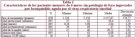El objetivo del presente estudio fue conocer los ingresos en UCIP de lactantes previamente sanos y los factores de riesgo de evolución grave en una serie de lactantes con BA por el VRS con el fin de construir un modelo de predicción de la evolución grave en esta enfermedad.