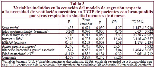 Resultados.: De 695 casos, precisaron VM en unidad pediátrica de cuidados intensivos 56 (8,1%). Los factores de riesgo) incluidos en la ecuación fueron: 1. Sexo varón (OR: 4,27) 2. Edad postmenstrual (OR:0,76) 3. Peso al ingreso <p3(OR: 5,53) 4. Ingesta <50% (OR:12,4), 5. Gravedad por escala (OR:1,58), 6. Apneas antes del ingreso (OR:25,5) 7. Sobreinfección bacteriana (OR: 5,03) y 8. Edad gestacional >37 semanas OR (0,32). El área bajo la curva, sensibilidad y especificidad fueron 0,943; 0,84 y 0,93 respectivamente.