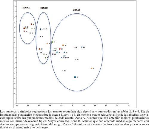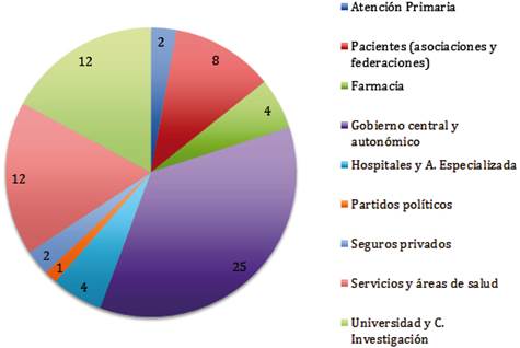 Posteriormente se realizó un muestreo intencional para seleccionar una muestra de personas expertas en sanidad, planificación, política y administración sanitaria, y se les solicitó permiso para enviarles una encuesta de valoración sobre la relevancia de determinados asuntos que pudieran ser incluidos en los planes de salud. El tamaño muestral fue de 70 personas de entre los diferentes grupos de interés según se muestra en la figura 1. No se establecieron criterios de exclusión toda vez que los candidatos en la muestra fueron elegidos de forma directa e intencional tras analizar su idoneidad. El criterio de inclusión en la muestra fue la pertenencia a instituciones académicas o de investigación, asociaciones, centros sanitarios públicos y privados, partidos políticos y otros actores vinculados a las políticas sanitarias. La encuesta se realizó a través de la plataforma online www.encuestafacil.com enviada por email con aceptación previa de los participantes. La encuesta estuvo disponible durante las dos últimas semanas del mes de enero de 2015 y se obtuvo un índice de respuesta superior al 47%. Se les solicitó que puntuaran cada asunto en una escala de 1 a 5, de menor a mayor nivel de relevancia siguiendo el modelo likert. Con las puntuaciones obtenidas de la encuesta se construyó una gráfica de puntuaciones medias y dispersión con base en la desviación típica de los datos para evidenciar el nivel de consenso en los asuntos sobre los que se preguntó. Para establecer las zonas de consenso se dividió el rango de la desviación típica en 3 zonas, considerando que a mayor desviación típica había menor consenso: Zona A: asuntos con bajo nivel de dispersión y claramente relevantes; Zona B: asuntos relevantes con nivel medio de dispersión y Zona C: asuntos relevantes con nivel alto de disenso o dispersión.