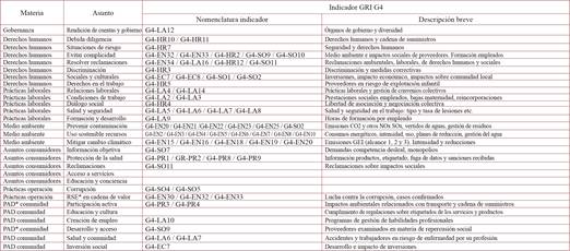 Los asuntos identificados como relevantes tenían indicadores asociados en el sistema de informes publicado por el Global Reporting Initiative (tabla 5).