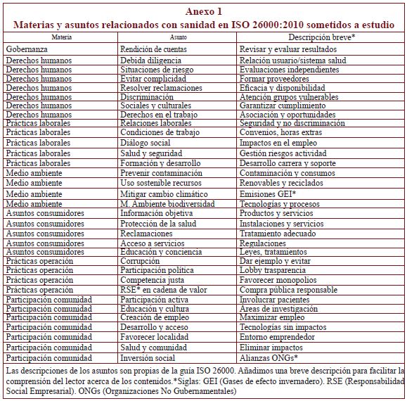 Resultados: De la revisión bibliográfica se obtuvieron 33 asuntos relacionados con sanidad incluidos en ISO 26000:2010. De la encuesta, 7 resultaron relevantes con alto consenso, 8 de relevancia y consenso medio y 18 con menor relevancia y alto nivel de disenso. El grupo de expertos excluyó 4 de los 18 asuntos con menor consenso.