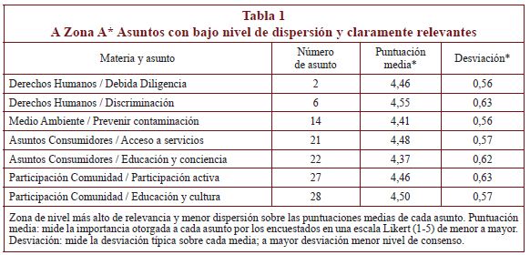 Los resultados de las puntuaciones medias se presentan en la figura 2 junto con la desviación típica obtenida en cada uno de los asuntos tratados. En la zona A del gráfico se situaron los que presentaron un bajo grado de disenso y alta puntuación media (tabla 1). Las puntuaciones medias de estas materias y asuntos fueron superiores a 4,3 y obtuvieron una desviación típica inferior a 0,7. En total 4 de las siete materias fundamentales de ISO 26000 tuvieron asuntos incluidos en esta zona como relevantes: derechos humanos, medio ambiente, asuntos de consumidores y participación activa en la comunidad.