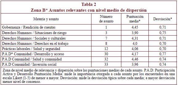 La zona B de la figura 2 aglutinó los asuntos con 3,9 de puntuación media o superior y una desviación de hasta 0,8 como se muestra en la tabla 2. La gobernanza se situó en la zona B y las prácticas laborales referidas a la salud y la seguridad laboral como asuntos relevantes con cierto nivel de desacuerdo, así como la prevención de los efectos no deseados del uso del sistema sanitario y el fomento de la inversión social.