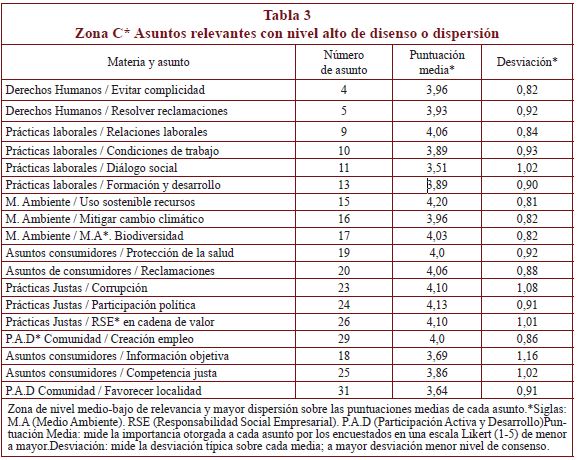 En la tabla 3 se muestran los asuntos que resultaron encuadrados como menos relevantes en la zona C de la figura 2, la cual muestra un elevado nivel de disenso medido por la desviación típica. En todos los casos fue mayor de 0,8 y con puntuaciones medias en algunos asuntos de tan solo 3,5, como es el caso del diálogo social en las prácticas laborales. Sobre estos asuntos se realizó una ronda de análisis con el panel de expertos para determinar finalmente cuáles no valoraban como relevantes.