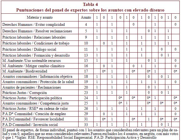 Las valoraciones del panel de expertos se presentan en la tabla 4. Con asteriscos aparecen los 4 asuntos que por decisión mayoritaria del panel resultaron no relevantes para incluir en un plan de salud: i) medio ambiente, en particular su relación con la biodiversidad ii) prácticas justas de operaciones, cuestiones relacionadas con lobbies y participación política iii) asuntos de consumidores relacionados con evitar la tendencia a favorecer monopolios de oferta y iv) participación activa y en concreto el fomento de la actividad local.