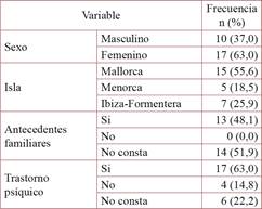 Durante el período estudiado se registraron 27 casos. El 100% tenían diagnóstico de EH. Eran mujeres 17 (63%). En la isla de Mallorca se registraron 15 casos. 17 (63%) personas padecían alguno de los trastornos psíquicos que acompañan a la EH. El antecedente familiar no constaba en el 51,9 % de las historias clínicas consultadas (tabla 1). La mediana de edad al diagnóstico fue de 56 años, mayor en mujeres (61 años) que en hombres (50 años).