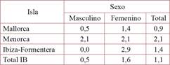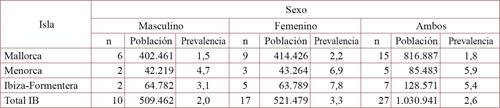 La prevalencia del período fue de 2,6 por 105 habitantes, siendo en mujeres de 3,3 por 105 y en hombres de 2,0 por 105. La mayor prevalencia (7,8 por 105) se observó en las mujeres de las islas Pitiusas (Ibiza y Formentera). Según la isla de residencia, la mayor prevalencia (5,9 por 105) se observó en Menorca (tabla 2).