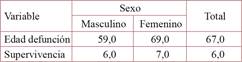 La mediana de edad de las personas fallecidas fue de 67 años, en las mujeres 69 años y en los hombres 59. La supervivencia tras el diagnóstico de EH fue de 6 años, menor en los hombres que en las mujeres (tabla 3).