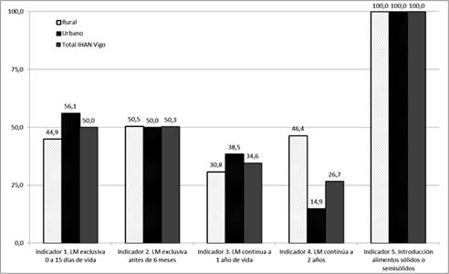 El indicador 4 (lactancia materna continúa a los 2 años) presenta diferencias estadísticamente significativas entre los ámbitos rural y urbano (46,4% vs 14,9%; p=0,007).