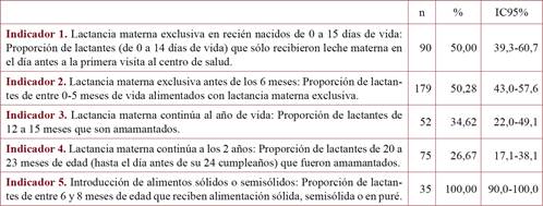 El indicador 1 es bajo comparado con nuestro entorno. Según la Encuesta Nacional de Salud 2011-201211, la lactancia natural (con los mismos criterios que la LME) es la alimentación más utilizada en los bebés durante las primeras 6 semanas (66,2%) y se reduce al 53,6% hasta los 3 meses. A los 6 meses, el 53,1% de los bebés son alimentados mediante lactancia artificial, dejando en segundo plano la lactancia natural (28,5%). La clase social basada en la ocupación, según los niveles socioeconómicos de la Sociedad Española de Epidemiología21, no afectaba demasiado al tipo de lactancia elegido.