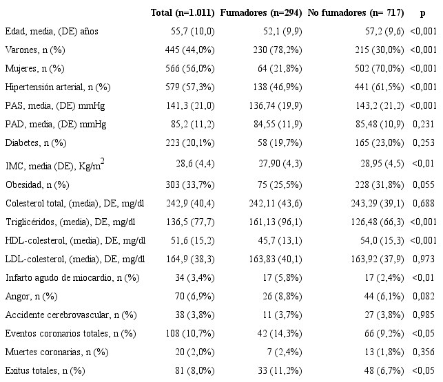Results: 29.1% of the patients were smokers. Smokers were younger (52.1 vs 57.2 years, p<0.001), with less prevalence of arterial hypertension (46.9% vs 61.5%, p<0.01), obesity (25.5% vs 31.8%, p=0,055) and lower HDL-cholesterol (45.7 vs 54.0 mg/dl, p<0.001). During the follow-up, they presented a higher mortality (11.2% vs 6.7%, p<0.05) and higher incidence of total coronary events (14.3% vs 9.2%, p<0.05). The final model of the logistic regression multivariate analysis revealed that only smoking and age are predictor variables of total coronary events, the greater odds ratio (OR) corresponding to smoking [OR: 2.33; 95% confidence interval (CI):1.31-4.16; p<0.01].
