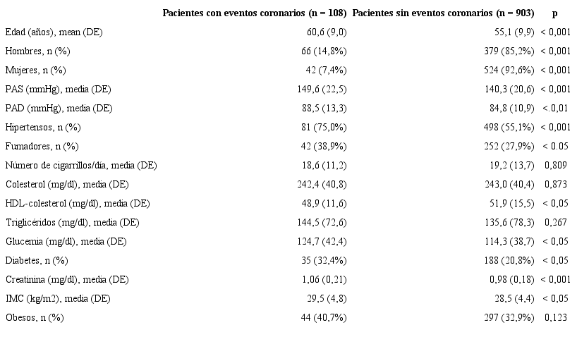 Un total de 108 pacientes (10,7% de los 1.011 incluidos) sufrieron algún tipo de evento coronario durante el seguimiento (el 14,8% de los varones versus 7,4% de las mujeres, p<0,05). Los pacientes con eventos coronarios tenían más edad, mayores cifras de PAS, PAD, glucemia, creatinina e IMC, y una mayor prevalencia de HTA (75,0% versus 55,1%, p<0,001), tabaquismo (38,9% versus 27,9%, p<0,05) y diabetes mellitus (32,4% versus 20,8%, p<0,05). Los pacientes con eventos coronarios presentaban también menores concentraciones de HDL-colesterol (48,9 versus 51,9 mg/dl, p<0,05; Tabla 2). La comparación entre hombres y mujeres con episodios coronarios mostró que los hombres eran más jóvenes (58,2 versus 64,3 años, p<0,001), con menor prevalencia de diabetes mellitus (25,8% versus 42,9%, p=0,064), mayor prevalencia de tabaquismo (59,1% versus 7,1%, p<0,001) y menores cifras de PAS (145,7 versus 155,9 mmHg, p<0,05), PAD (86,6 versus 91,6 mmHg, p<0,05), HDL-colesterol (45,9 versus 53,6 mg/dl, p<0,01) e IMC (28,3 vs 30,6 Kg/m2, p=0,091).