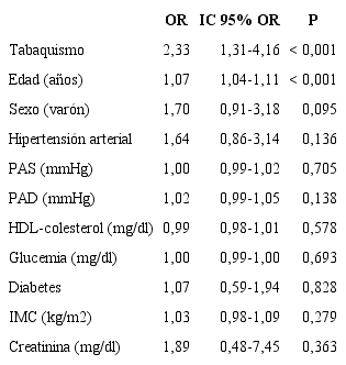 El modelo final de regresión logística reveló que solamente la edad y el tabaquismo se comportaron como variables predictoras de eventos coronarios, correspondiendo al tabaquismo la mayor OR (2,33; IC 95%: 1,31-4,16, p<0,01) (tabla 3).