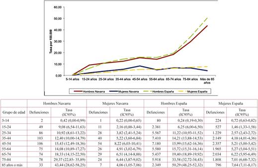 En la figura 1 se comparan las tasas específicas de mortalidad para todo el periodo por grupos de edad en España y Navarra, observándose que las tasas eran muy similares en todos los grupos de edad.