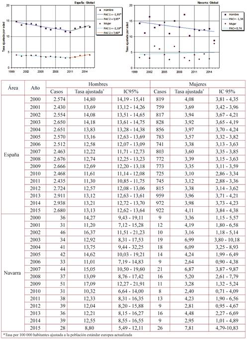Resultados: En España las tasas globales de suicidio presentaron una tendencia descendente significativa entre los años 2000 y 2011 (PAC:-1,93% en hombres y -2,19% en mujeres) que se siguió de un aumento significativo en 2012-2015 (PAC:3,65% en hombres y 7,60% en mujeres). No se observaron puntos de inflexión en los hombres de 25 a 44 (PAC:-1,26%) y de 45 a 64 (PAC:1,63%) ni en las mujeres mayores de 65 años (PAC:-2,18%). En Navarra las tasas globales en hombres presentaron un descenso no estadísticamente significativo anual de -1,56% y disminuyeron significativamente en los hombres de 25 a 44 años a un ritmo de -3,19%. Entre las mujeres se observó un aumento no significativo anual de 0,74%.