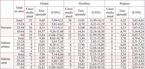 Durante el periodo 2000 a 2015 se registraron en Navarra un total de 826 fallecimientos. El 99,6% de los fallecidos eran mayores de 14 años y el 73,4% hombres. En la tabla 1 se presenta el número de fallecimientos por suicidio y las tasas por 100.000 habitantes por sexo, grupo de edad y hábitat. Entre los hombres, las tasas más altas se registraron en los mayores de 64 años, tanto a nivel urbano (25,1; IC95%:19,29-30,97) como rural (25,6; IC 95%:20,94-30,34). Entre las mujeres, las tasas más elevadas se registraron en el grupo de 45-64 años a nivel urbano (10,9; IC95%:8,18-13,70) y entre las mayores de 64 años a nivel rural (7,2; IC 95%: 4.95-9,41). De forma consistente, la tasa en hombres mayores de 64 años (25,6) fue significativamente más alta que en los demás grupos de edad. En las mujeres las tasas se estabilizaron a partir de los 45 años. La tasa global de suicidio en las mujeres que residían en los núcleos urbanos de Navarra fue estadísticamente más elevada que la registrada a nivel rural (5,7; IC95%: 4,70-6,70 y 3,3; IC95%:2,65-4,03) respectivamente.