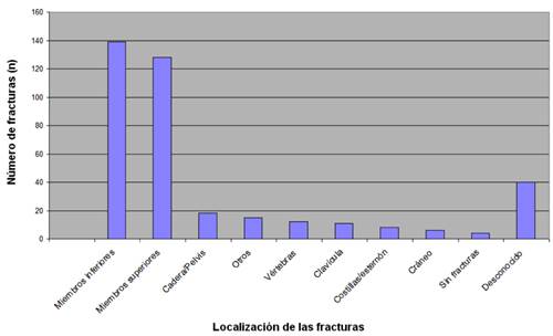 Se determinó el número de fracturas que había sufrido cada paciente. Entre 0 y 10 fracturas las sufrieron más de la mitad de los casos (56,5%), entre 11 y 20 un 19,3% de los casos y más de 20 fracturas en su vida un 1,4%. Por último, un 22,8% de los casos tenían un número desconocido de fracturas a lo largo de su vida.