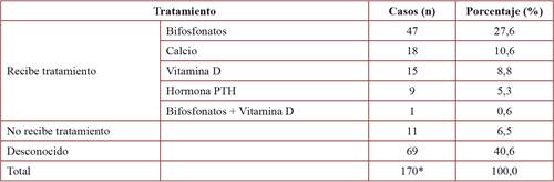 Respecto al tratamiento farmacológico más administrado a los pacientes, en el 52,1% de los casos sí se identificó que tipo de medicación se les administraba pero en el resto de casos (47,9%) esta información no estaba disponible. De los que si recibían tratamiento, el 44,8% de los pacientes tenía como tratamiento principal los bifosfonatos. Los otros tratamientos identificados fueron el calcio, la vitamina D, la hormona PTH, el bifosfonato junto a vitamina D y administración de tratamiento no especificado (desconocido) (tabla 2). En lo que concierne a los tratamientos quirúrgicos más utilizados, el 53,5% fueron reducciones abiertas, el 13,4% fueron reducciones cerradas, el 15,5% de casos no precisó ningún tipo de cirugía y el 17,6% de los casos no se disponía de información al respecto.