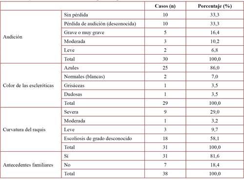 Otro aspecto es el color de las escleróticas de los pacientes (tabla 3). Se disponía información acerca de esta variable en un 20,0% de los casos. El color azul de las escleróticas llegaba hasta el 86,0% (25 pacientes), el 7.0% tenía fenotipo normal (escleróticas blancas) y el 3,5% de los casos que tenían las escleróticas con tonos grisáceos. Por último, otro 3.5% de los pacientes tenía el color de las escleróticas por determinar. En relación a la curvatura en cualquier punto del raquis (tabla 3), en los 13 casos con escoliosis (el 21,4% del total de casos confirmados) se diferenció entre grados de severidad. La escoliosis severa supuso el 29,0% de los pacientes con el grado de severidad de escoliosis conocida. La severidad leve contó con el 9,7% de los casos y la curvatura moderada la poseían el 3,2% de los afectados. El resto (58,1%) tenían escoliosis pero no se indicaba la graduación en la curvatura del raquis por lo que no se pudo determinar su severidad.