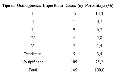 Tan sólo se conocía el tipo de OI en el 24,8% de los pacientes por la poca información genética de la que se disponía en las historias clínicas. Este puede deberse, en parte, a que estos tipos de tests sólo se llevan a cabo en hospitales de referencia y en muchos casos la información genética existe, pero no se incorpora a la documentación clínica electrónica. En este estudio el tipo I de OI supuso el 47,2% de los pacientes con la enfermedad tipificada, lo que supone una ligera diferencia con otros estudios donde los pacientes con este tipo de OI representan el 53,8%20, el 50% o entre el 50 y 60%21.