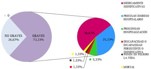 Según los criterios establecidos por la Unión Europea, de las 133 RAMs que constaban en las 75 notificaciones, 108 fueron consideradas como graves (81,2%) y 25 fueron consideradas como no graves (18,8%). En el análisis de la gravedad de las 75 notificaciones registradas, 55 fueron consideradas como graves globalmente (73,33%) y 20 fueron consideradas no graves (26,67%) (figura 2).