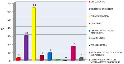 El tratamiento precisado para las 133 reacciones adversas registradas, en su mayoría fue farmacológico (64 reacciones) o higiénico-dietético (30) (figura 3).