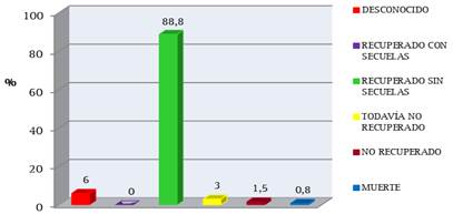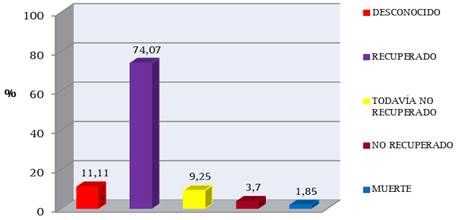 El desenlace de las 133 reacciones notificadas y la evolución de los 54 pacientes se exponen en las figuras 4 y 5 por separado dado que algunos pacientes sufrieron reacciones de diversas gravedades y por tanto con resoluciones distintas.