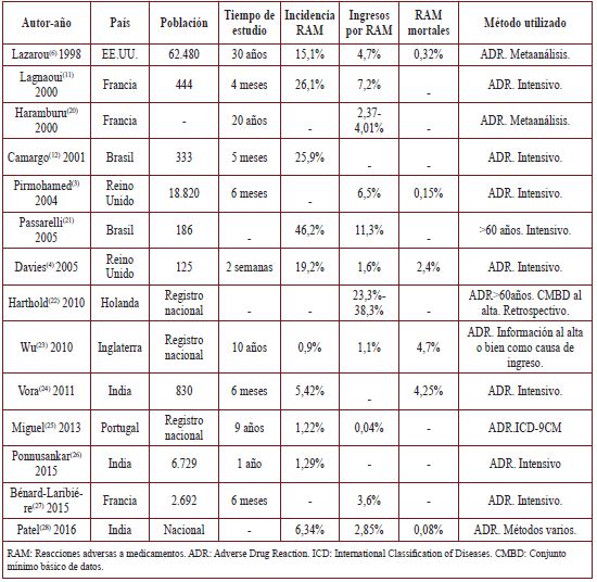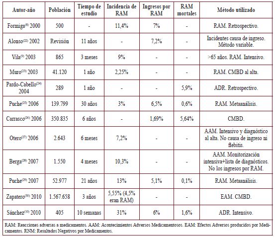 La revisión de los estudios disponibles en la literatura médica relativos a la incidencia de RAM a nivel hospitalario internacional (Anexo 1) y nacional (Anexo 2) mostró la existencia de diferencias metodológicas entre ellos dificultando así la obtención de datos comparables. Dichas diferencias se deben fundamentalmente a la propia definición de RAM, a la variedad de métodos elegidos para la detección de las mismas y a los objetivos y población seleccionada. Esto provoca que los datos de incidencia de la iatrogenia medicamentosa parezcan a veces contradictorios dificultando extraordinariamente una valoración global de la misma.