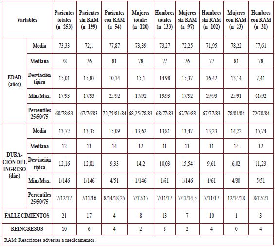 Resultados: Se monitorizaron 253 pacientes. Se detectaron RAM en 54 pacientes (21,34%), encontrándose una asociación positiva entre la edad y la presencia de RAM (p=0.012). La incidencia de ingresos causados por una RAM fue de 7,11% y las RAM mortales fueron un 1,97%. Las RAM fueron graves en el 81,2% de los casos. Los órganos más afectados fueron el gastrointestinal, trastornos del metabolismo y de la nutrición y el vascular. Los grupos terapéuticos causantes de RAM más frecuentes fueron los agentes cardiovasculares, los antinfecciosos y los del sistema nervioso. El 72,2% de los pacientes que sufrieron RAM presentaban polimedicación.