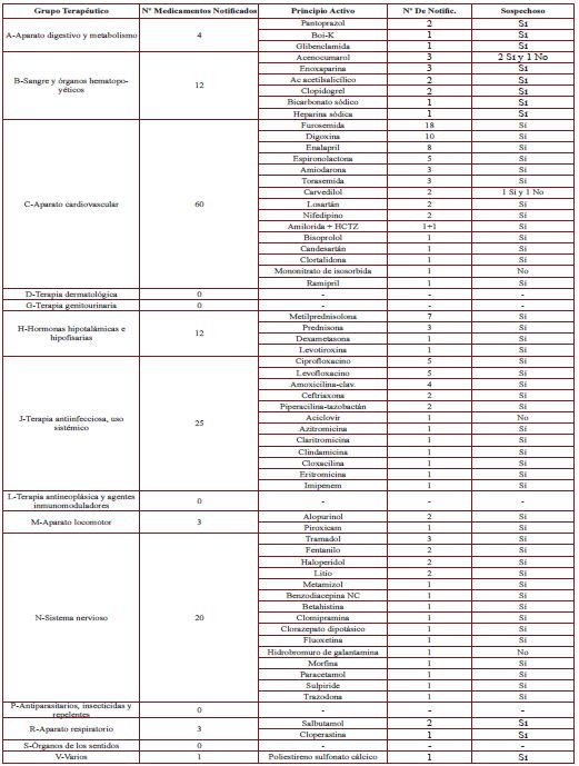 En la tabla 3 aparecen los medicamentos notificados como sospechosos de la generación de las RAMs con su frecuencia de aparición y el grupo terapéutico al que pertenecen, y en la tabla 4 las indicaciones terapéuticas por las que fueron prescritos. De todos ellos, los fármacos pertenecientes al grupo terapéutico C (aparato cardiovascular) fueron los que registraron un mayor número de notificaciones, seguidos por los pertenecientes al grupo terapéutico J (terapia antiinfecciosa, uso sistémico, subgrupo J01 antibacterianos) y al grupo N (sistema nervioso).