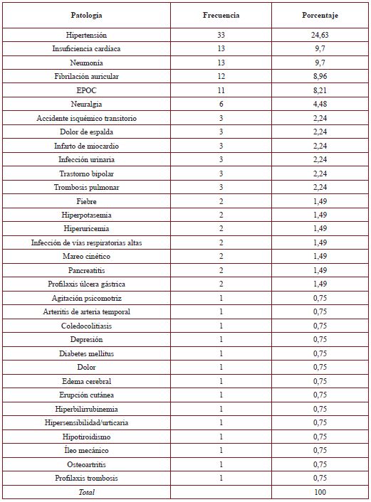 De los 253 pacientes estudiados 54 (21,34%) sufrieron, al menos, una reacción adversa, y uno de ellos tuvo reacciones en los dos ingresos que padeció durante el periodo de estudio y se obtuvieron 75 notificaciones con 133 signos o síntomas en los que 135 medicamentos se consideraron sospechosos.