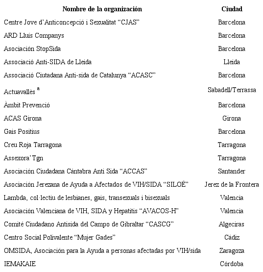 Listado de organizaciones que participan en la red COBATEST española de centros comunitarios para de diagnóstico y la orientación del VIH y que usan las herramientas comunes