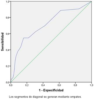 El análisis de la Curva ROC (figura 1) reveló una capacidad discriminativa media del PDPI-R con un área bajo la curva de 0,715 p=0,05. Dado que según aumentaba la especificidad, disminuía la sensibilidad de la Curva ROC, se utilizó el Índice de Youden para identificar el punto de corte óptimo, el cual correspondió con el valor 4 y se asoció a un nivel de sensibilidad de 0,623 y de especificidad de 0,695. La sensibilidad del PDPI-R para detectar embarazadas en riesgo de depresión es media, con un valor predictivo positivo del 22%. La especificidad del instrumento para identificar embarazadas fuera de riesgo es alta, con un valor predictivo negativo del 93%.