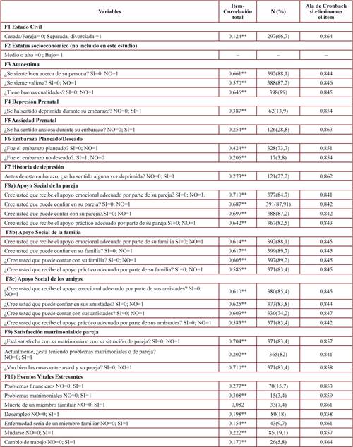 Además se realizó un análisis de frecuencia de cada uno de los ítems. Los factores de riesgo más frecuentemente encontrados fueron ansiedad durante el embarazo (28,8%), historia de depresión previa (27,2%), mudarse (19,15) y desempleo (18%) (tabla 1).