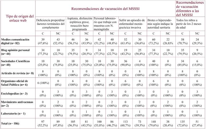 La frecuencia con la que se detectaron recomendaciones de vacunación ajustadas al MSSSI osciló entre el 52,2% (97/186) de los enlaces en los que constaba la indicación de vacunación en personas con deficiencia de properdina/deficiencias de factores terminales del complemento, y el 79,6% en los que constaba la recomendación en situaciones de brotes. Por otro lado, la recomendación de vacunar a todos los niños a partir de los dos meses de edad fue una indicación que, sin haber sido establecida por el MSSSI, se detectó en el 72,6% de los enlaces (tabla 1). Asimismo, en el 16,7% (31/186) de los enlaces se observó la desfasada recomendación del MSSSI de vacunar a personas que habían sufrido más de un episodio de EMI7 (en particular en 18, 8, 4 y 1 enlaces web dependientes de, respectivamente, blogs de opiniones personales, artículos de revistas indexadas, Sociedades Científicas y medios de comunicación digital); dicho hallazgo apareció en 4 y 27 enlaces cuyas fechas de actualización fueron, respectivamente, anteriores y posteriores a enero de 2015 (momento en el que MSSSI elaboró la actualización correspondiente8).